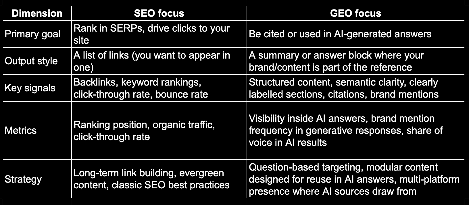 In short: SEO = get visible in search; GEO = get included in AI answers.